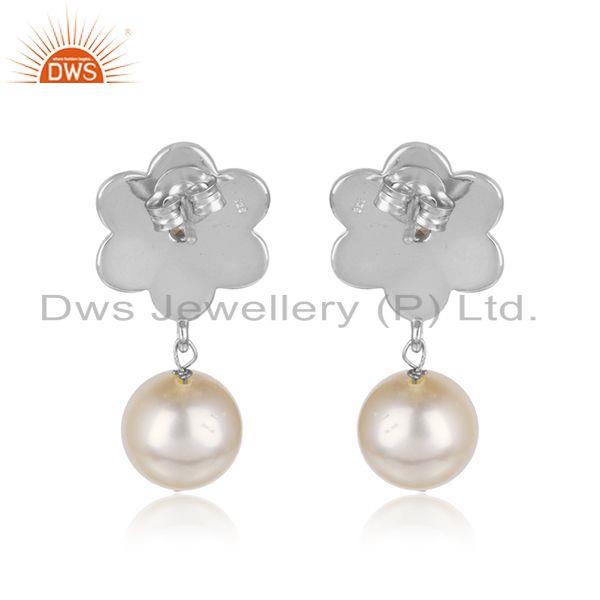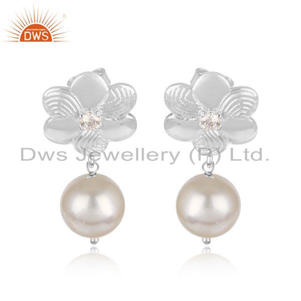 White Rhodium Plated Flower Design Cz Pearl Gemstone Earrings