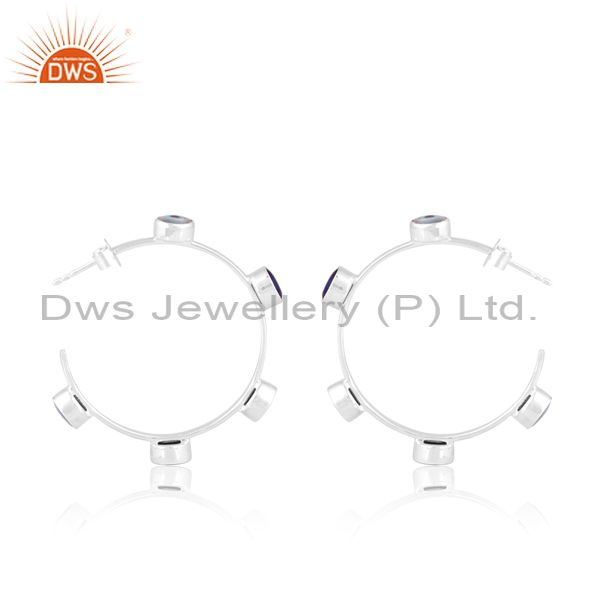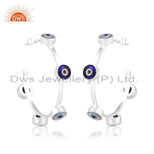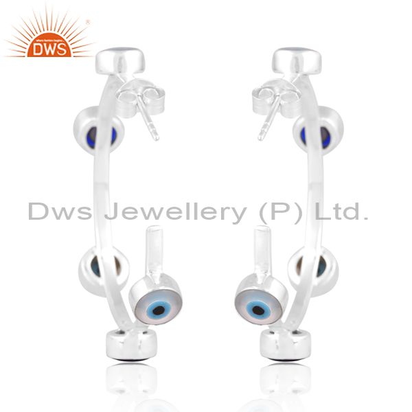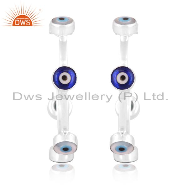 White Silver Earring With Blue Resin Coin Evil Eye & Pearl