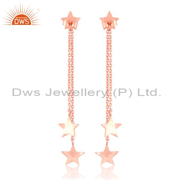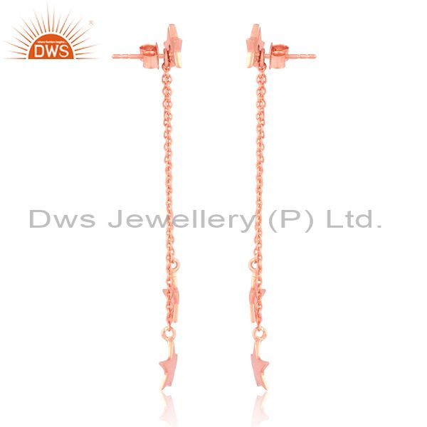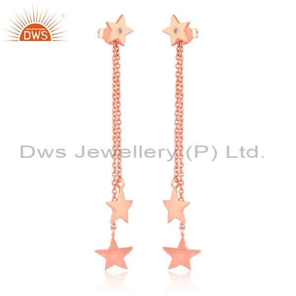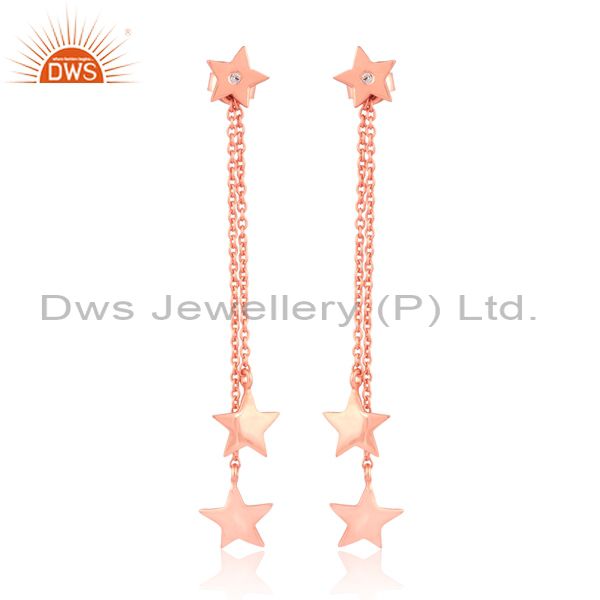 White Topaz Set Rose Gold On Silver Long Drop Star Earrings