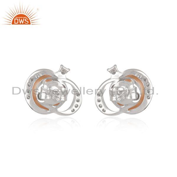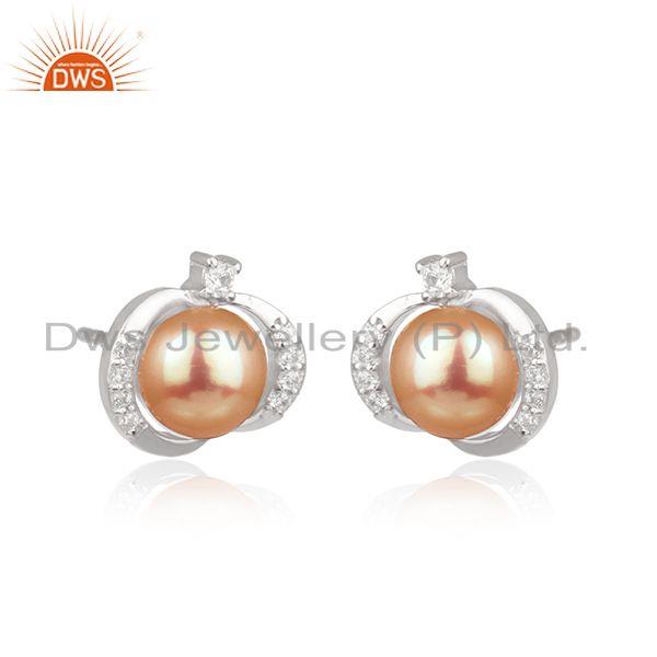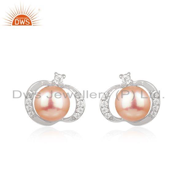 Zircon Pink Pearl White Rhodium Plated Silver Designer Stud Earrings