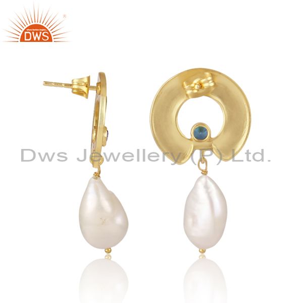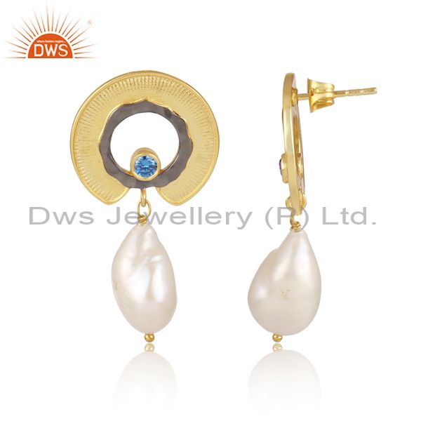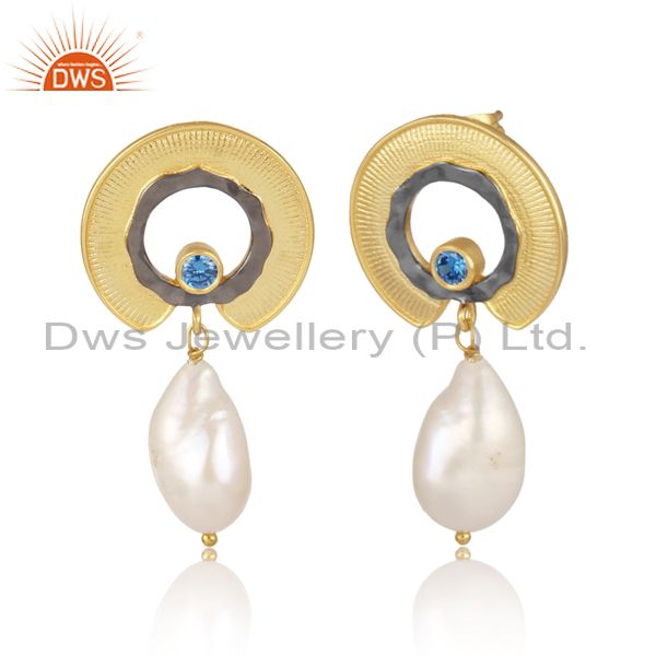 Zircon Swiss Blue Topaz, And Pearls Set Brass Gold Earrings