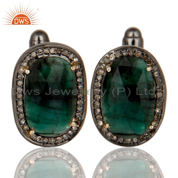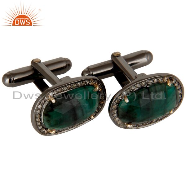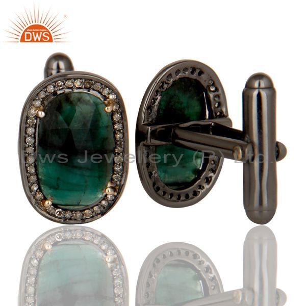 14K Solid Yellow Gold Pave Diamond And Emerald Gemstone High Fashion Cufflinks