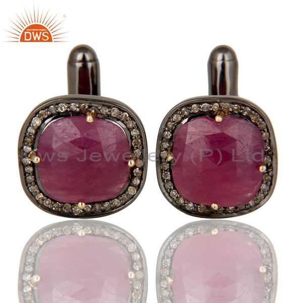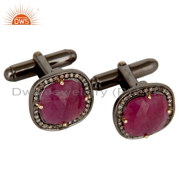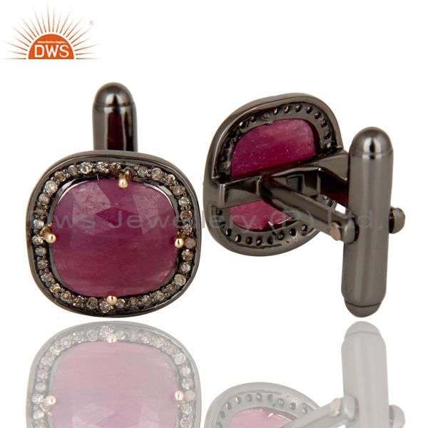 14K Solid Yellow Gold Pave Set Diamond And Ruby Sterling Silver Mens Cufflinks