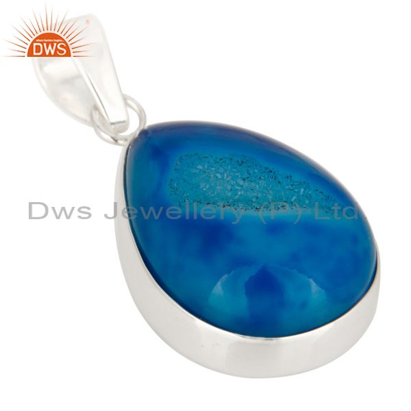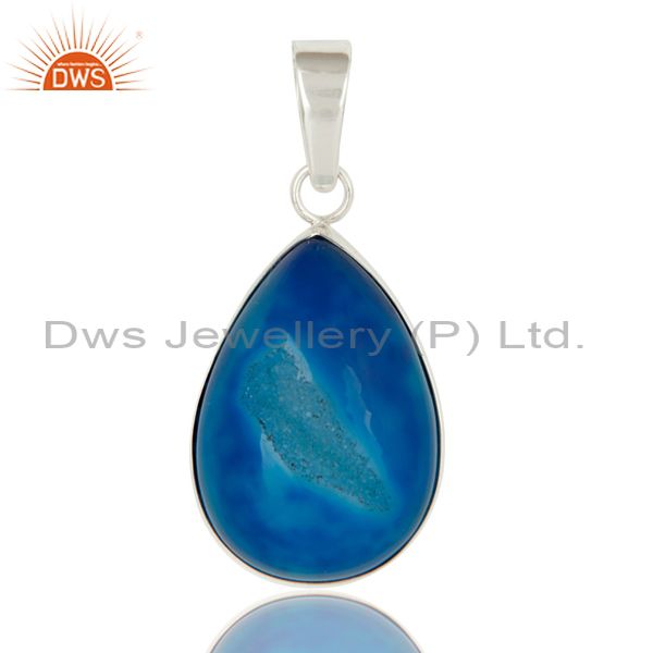 Natural Blue Druzy Agate Handcrafted Sterling Silver Bezel Set Pendant