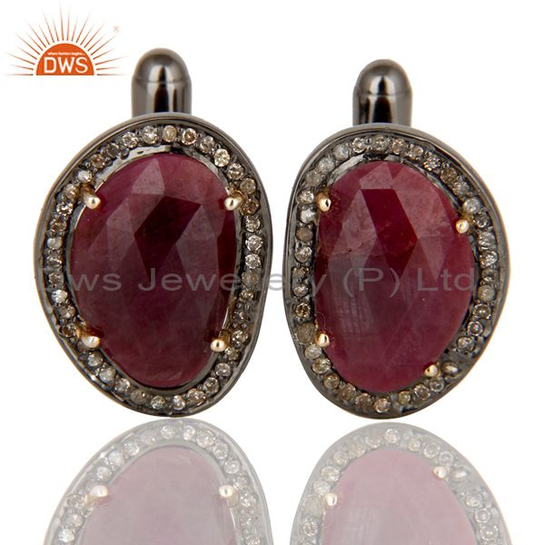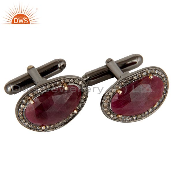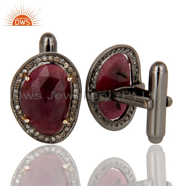 Solid 14K Yellow Gold Pave Set Diamond And Ruby Sterling Silver Mens Cufflinks