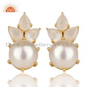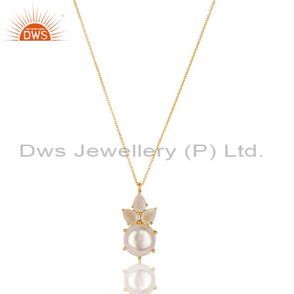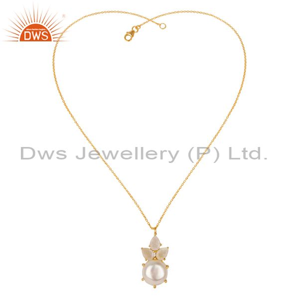14K Gold Plated 925 Silver Pearl & Rainbow Moonstone Prong Set Chain Pendant