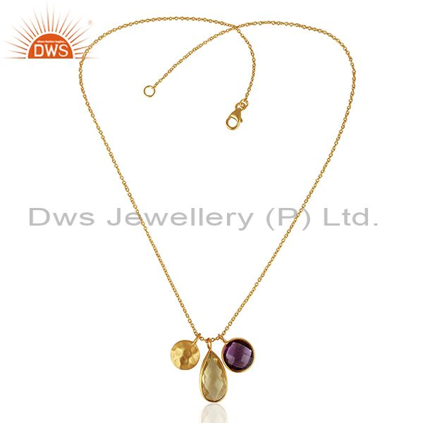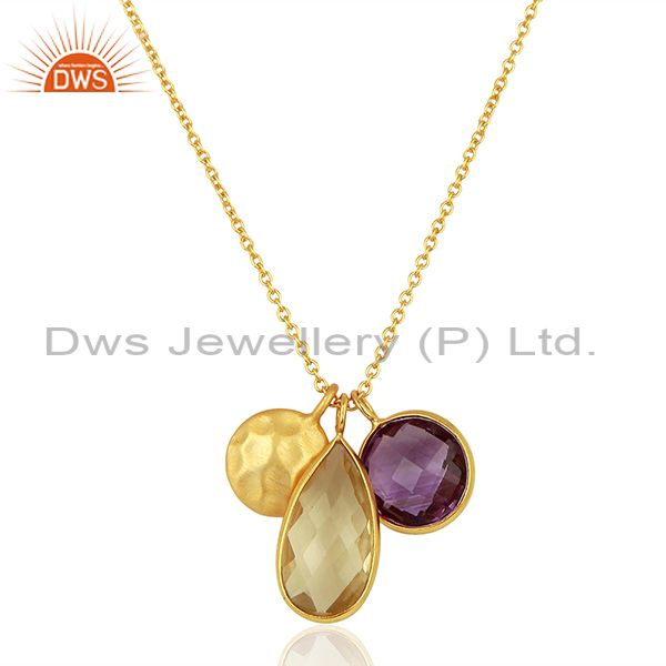 14K Gold Plated 925 Sterling Silver Lemon Topaz & Amethyst Chain Drops Pendant