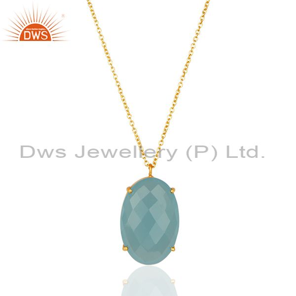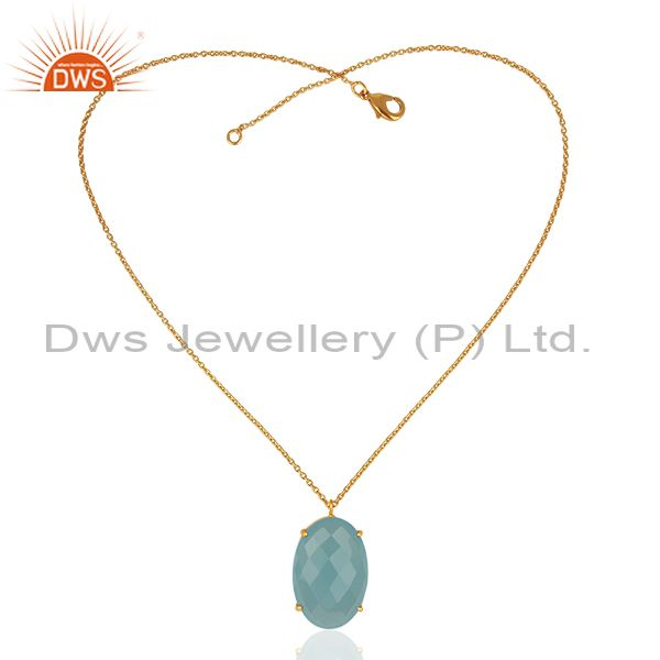14K Gold Plated Handmade Dyed Aqua Chalcedony Prong Set Chain Pendant