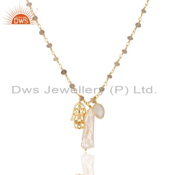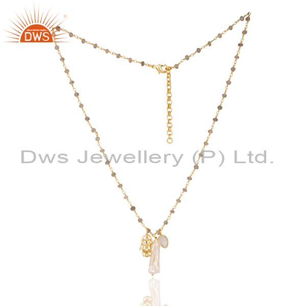 14K Gold Plated Rainbow Moonstone & Water Pearl 23 Inch Chain Brass Pendant