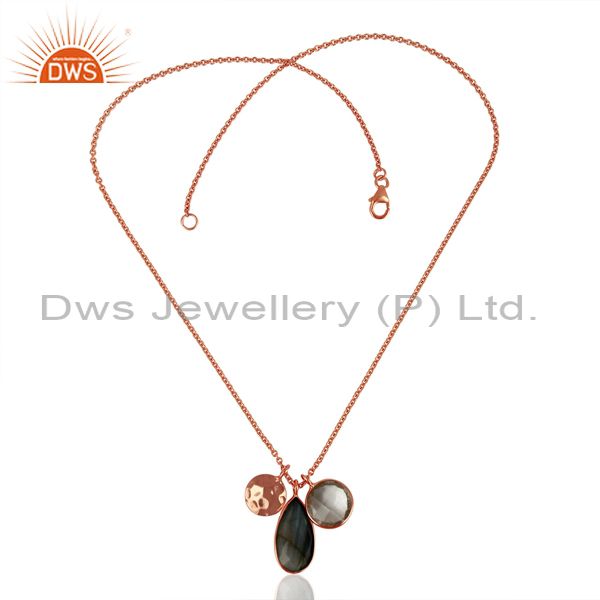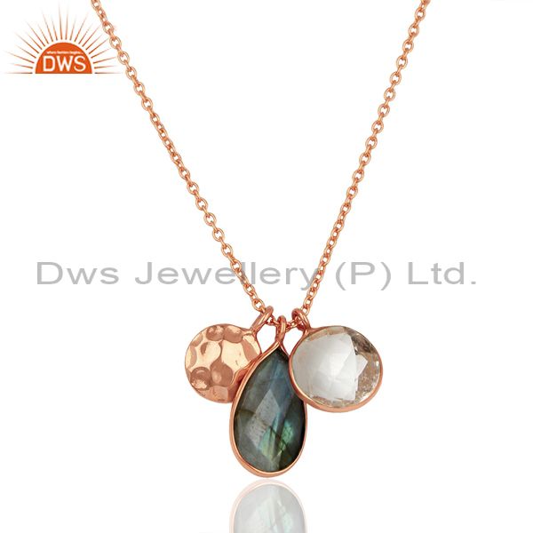 14K Rose Plated 925 Sterling Silver Labradorite & Crystal Quartz Chain Pendant