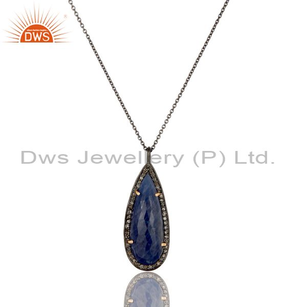 14K Solid Yellow Gold Blue Sapphire And Diamond Accented Drop Pendant With Chain