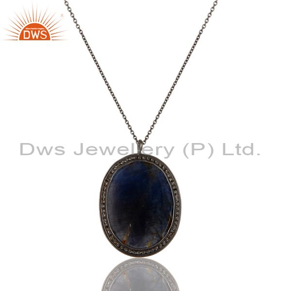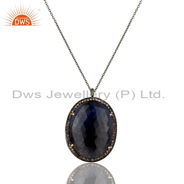 14K Yellow Gold Pave Diamond And Blue Sapphire Sterling Silver Pendant Necklace