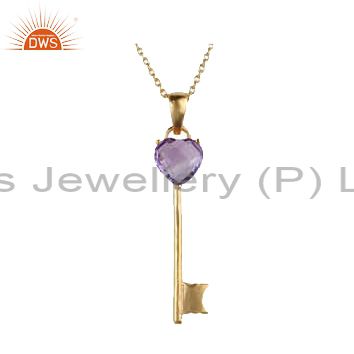 14K Yellow Gold Plated Sterling Silver Natural Amethyst Heart Key Charm Pendant