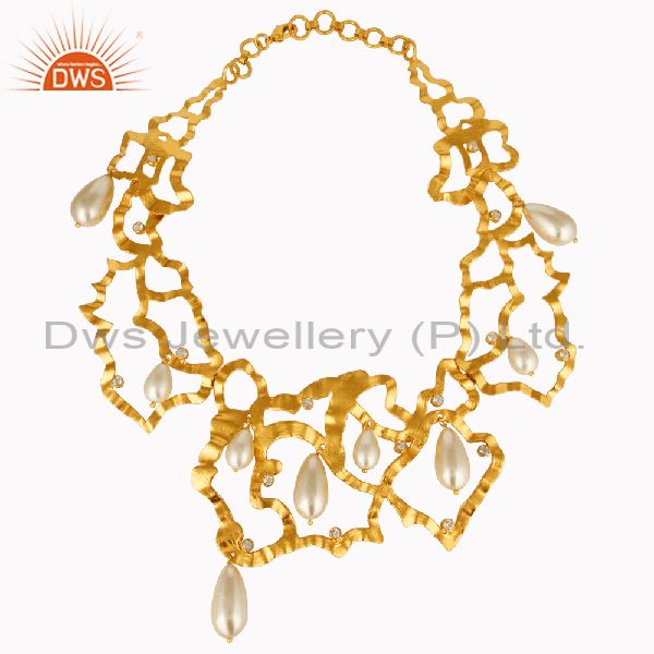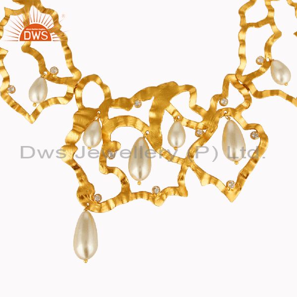 18K Gold Plated Pearl And White Topaz Handmade Art Deco Designer Necklace