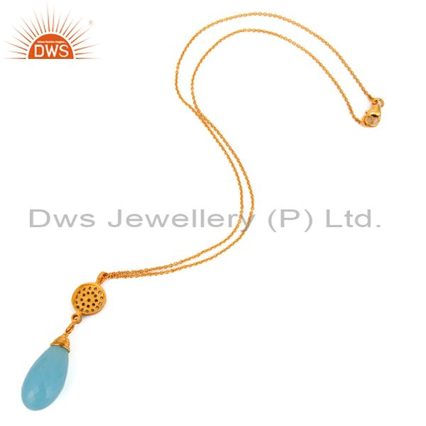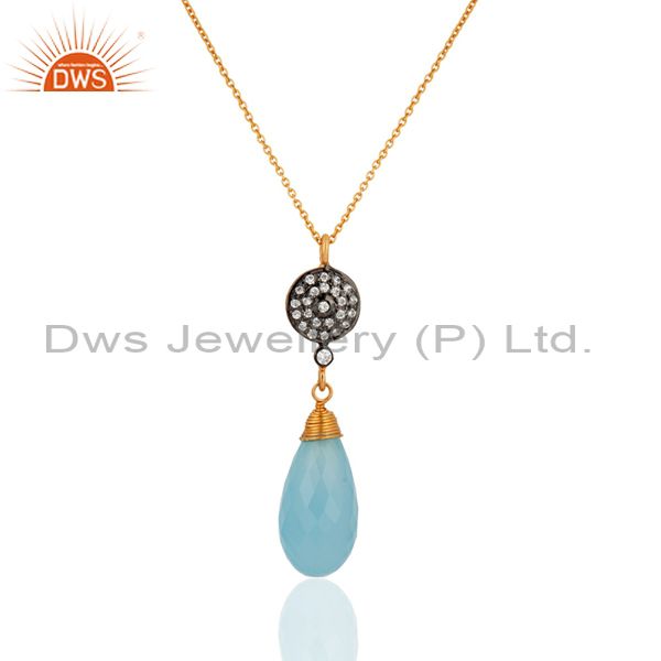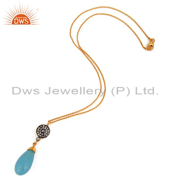 18K Gold Plated Silver Aqua Blue Chalcedony Briolette Drop Pendant With Chain