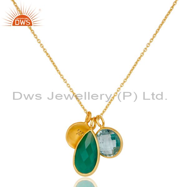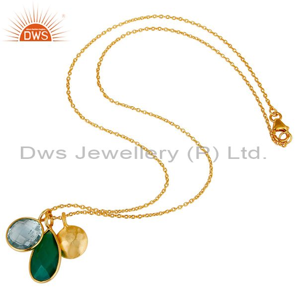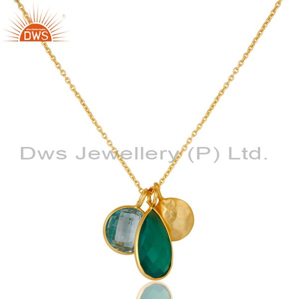 18K Gold Plated Sterling Silver Bezel Set Blue Topaz & Onyx Pendant With Chain