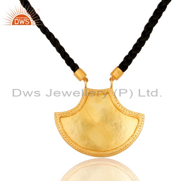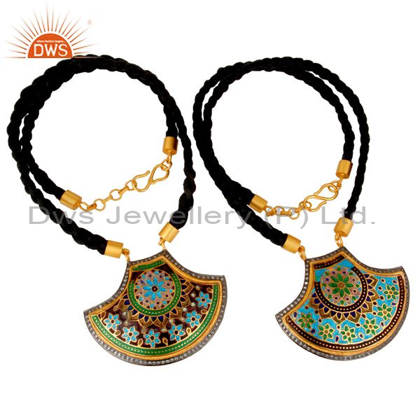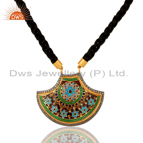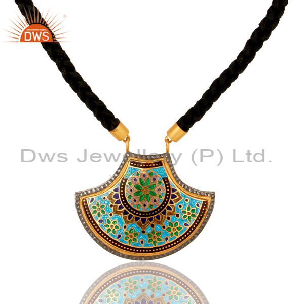 18K Gold Plated Sterling Silver Cz Enamel Designer Pendant Black Cord Necklace