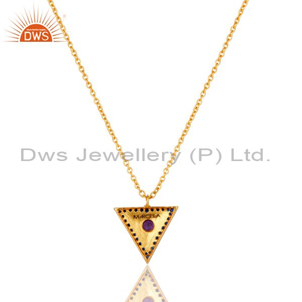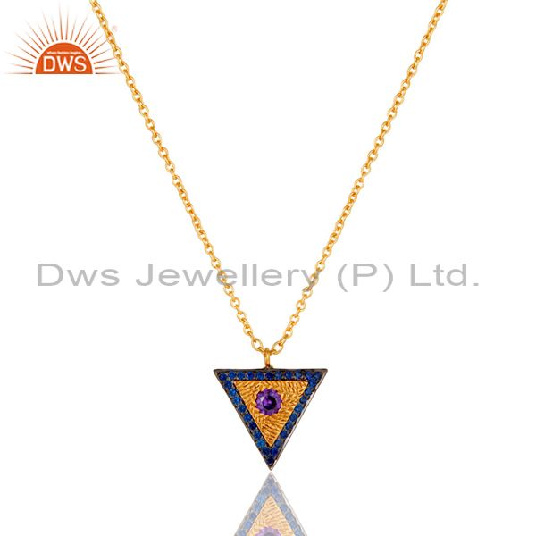 18k Gold Plated Zircon Blue Sappire Bezel Set Designer Look Chain Brass Pendant