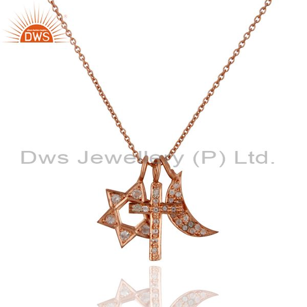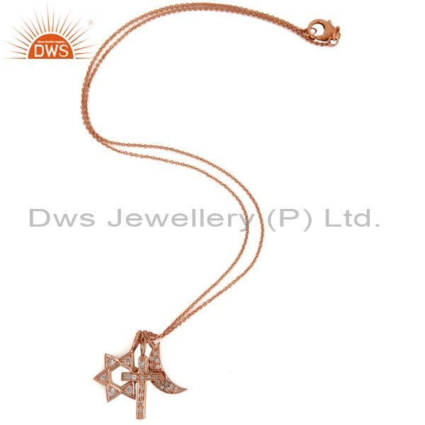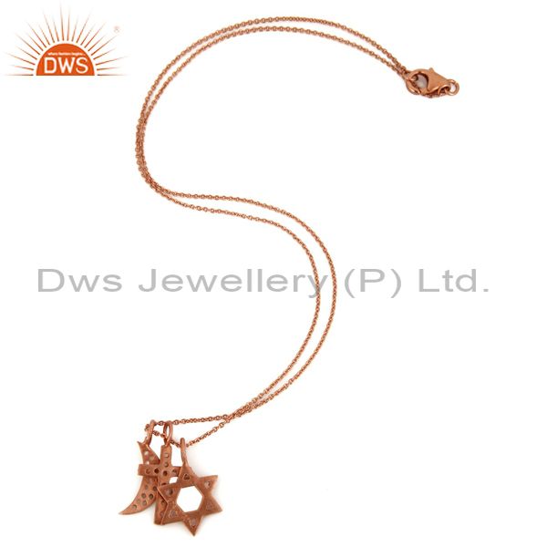 18K Rose Gold Plated Silver White Topaz Cross, Half Moon & Star Charms Necklace