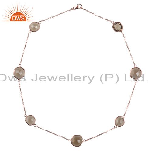 18K Rose Gold Plated Sterling Silver Smoky Quartz Bezel Set Link Chain Necklace