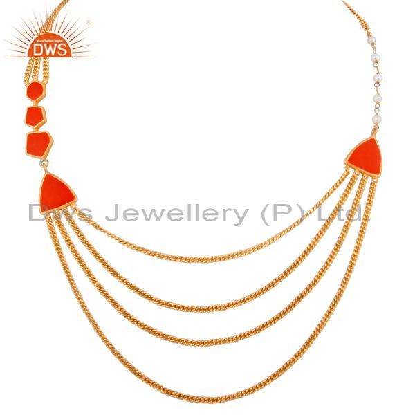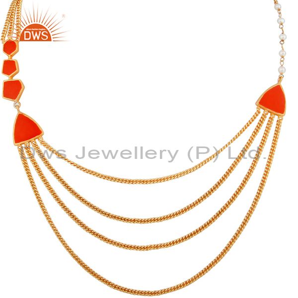 18K Yellow Gold Plated Brass Three Layered Chain Necklace With Red Enamel