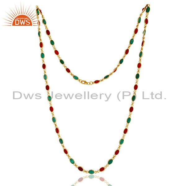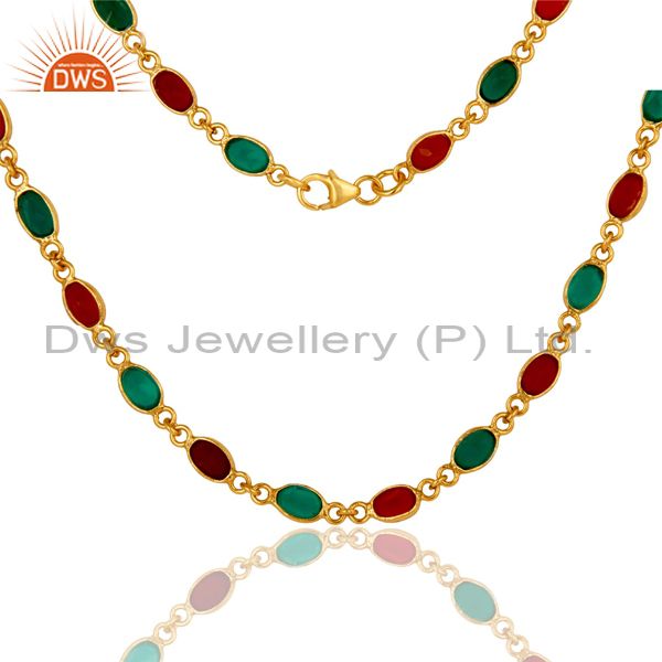 18K Yellow Gold Plated Sterling Silver Green Onyx And Red Onyx Chain Necklace