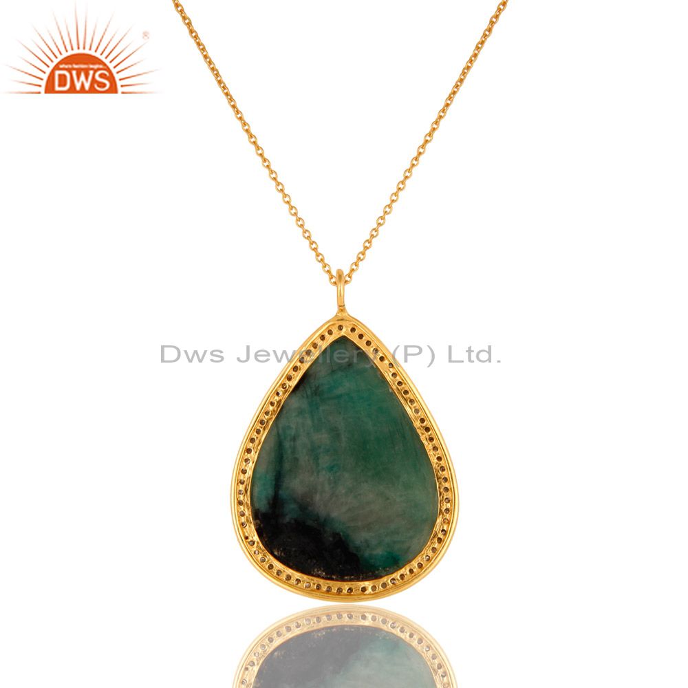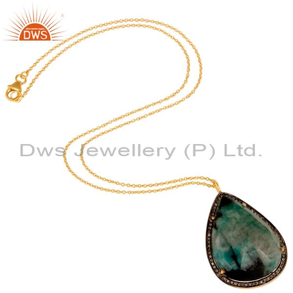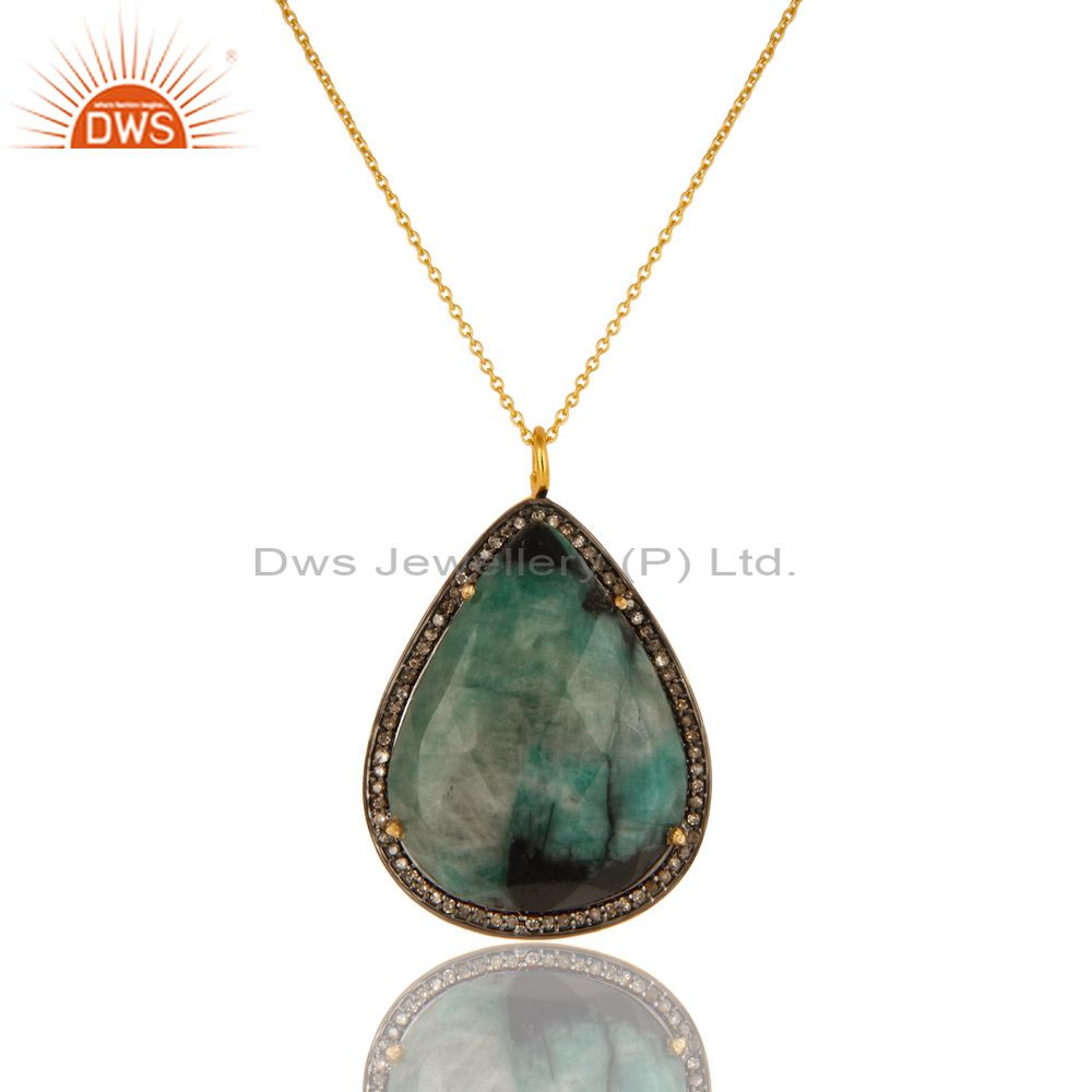 18K Yellow Gold Sterling Silver Emerald And Pave Diamond Pendant With Chain