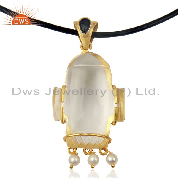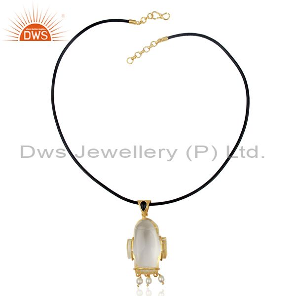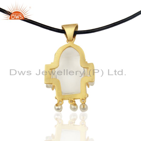 22K Gold Plated Sterling Silver Crystal Quartz And Pearl Pendant With Black Cord