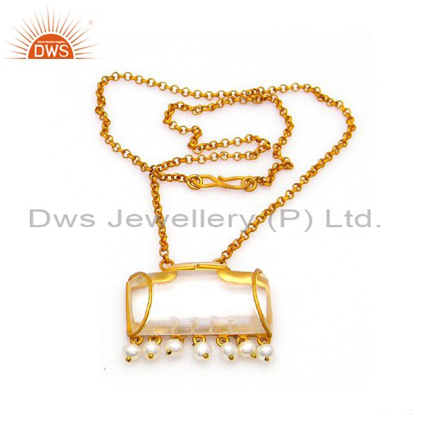 22K Gold Plated Sterling Silver Crystal Quartz And Pearl Pendant With Chain