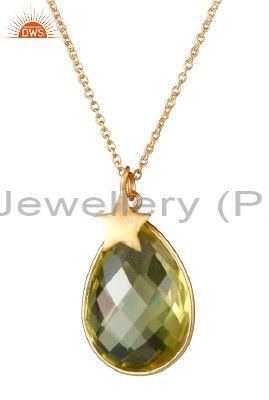 22K Gold Plated Sterling Silver Lemon Topaz Bezel Set Drop Pendant With Chain