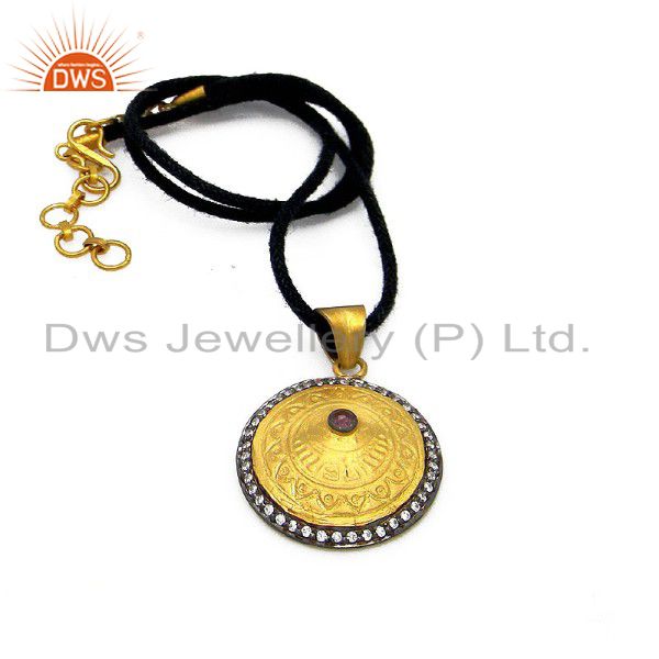 22K Gold Plated Sterling Silver Pink Tourmaline And Cz Pendant With Black Cord