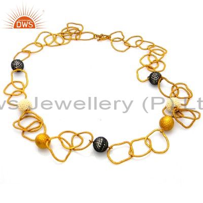 22K Yellow Gold Plated Brass Cubic Zirconia Hammered Link Chain Necklace