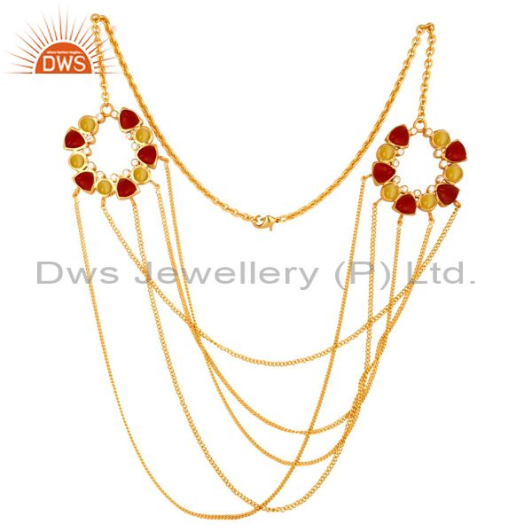22K Yellow Gold Plated Brass Moonstone And Red Coral Chain Necklace