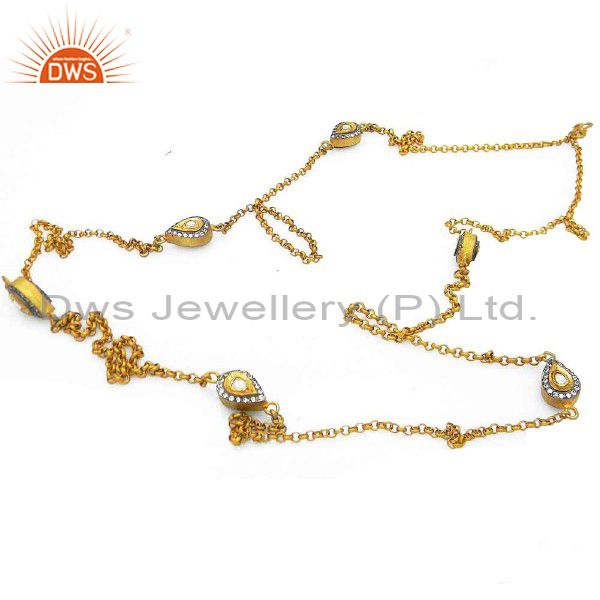 22K Yellow Gold Plated Silver Cz Crystal Polki Vintage Designer Chain Necklace