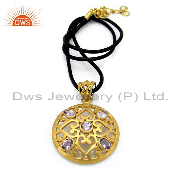 22K Yellow Gold Plated Sterling Silver Blue Topaz Pendant With Black Cord