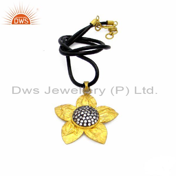 22K Yellow Gold Plated Sterling Silver Cz Flower Design Pendant With Black Cord