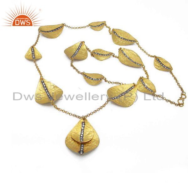 22K Yellow Gold Plated Sterling Silver Hammered Cz Petals Chain Necklace
