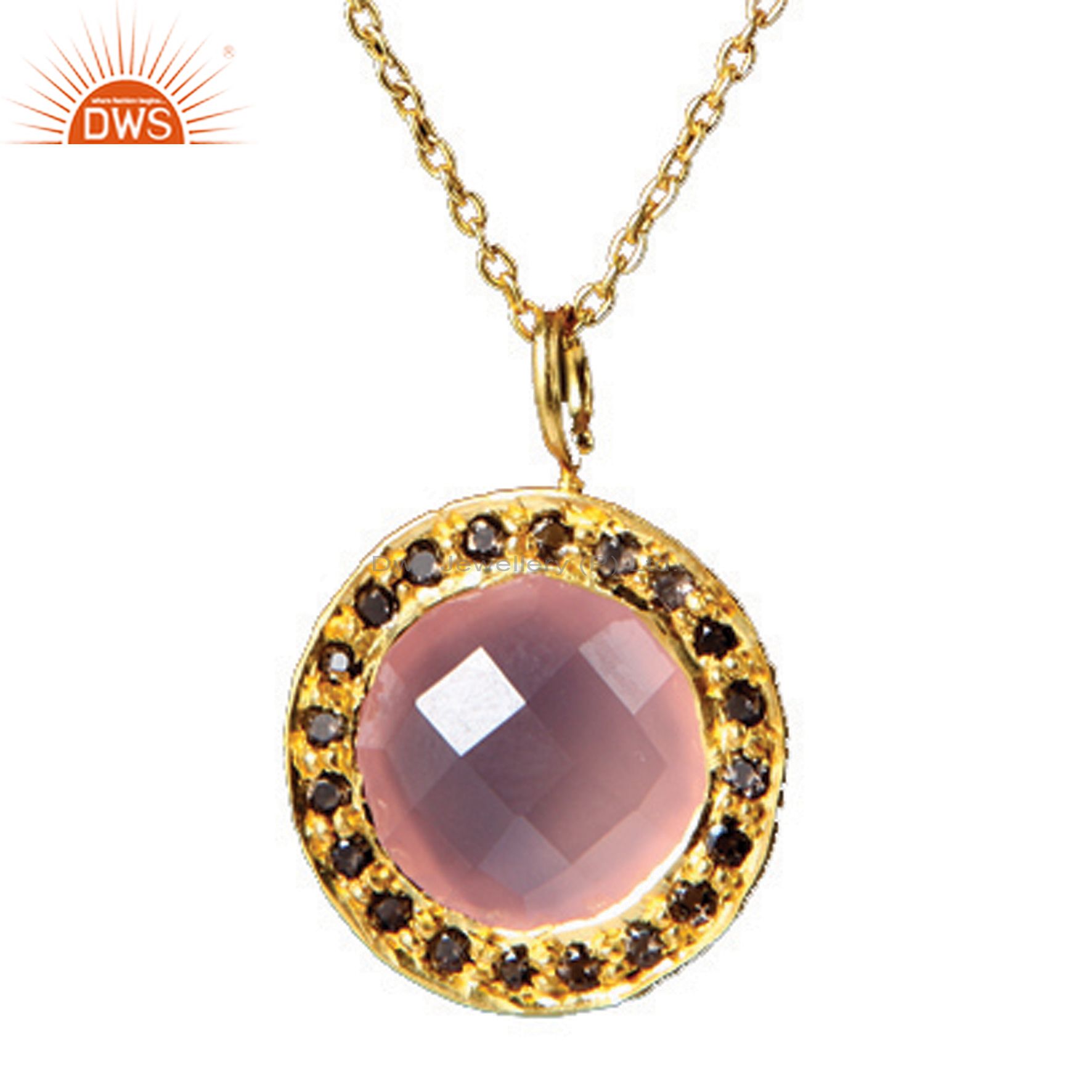 24K Gold Plated Sterling Silver Rose Chalcedony & Smoky Quartz Pendant Necklace