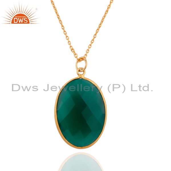 24K Yellow Gold Plated Sterling Silver Green Onyx Bezel Set Pendant With Chain