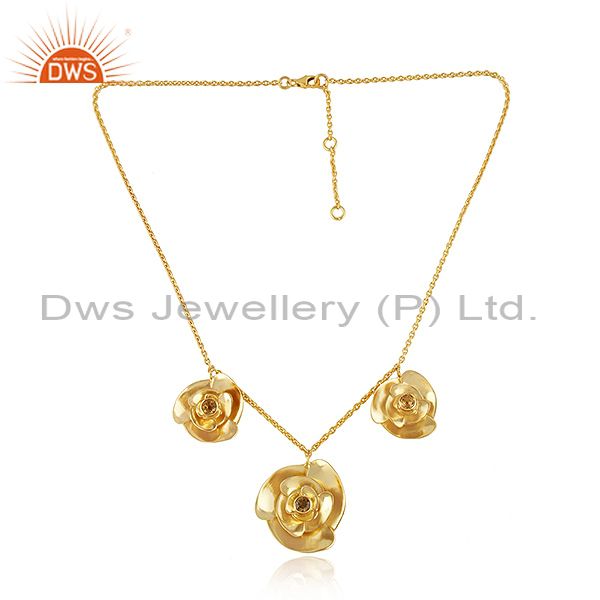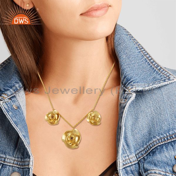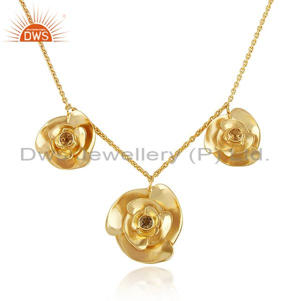 3 Rose Design Gold Plated Silver Citrine Gemstone Chain Necklace