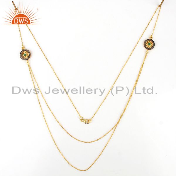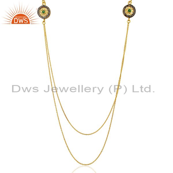 925 Sterling Silver Emerald Gemstone Pave Diamond Double Layers Chain Necklace