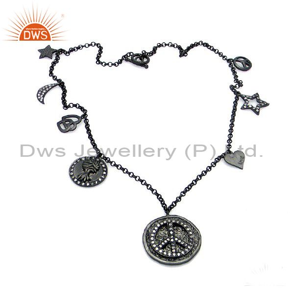 Black Rhodium Plated Sterling Silver Cubic Zirconia Religious Charms Necklace
