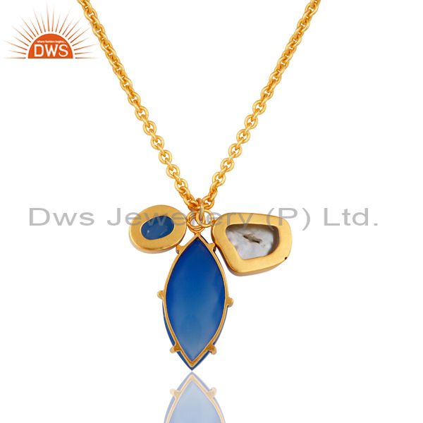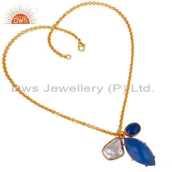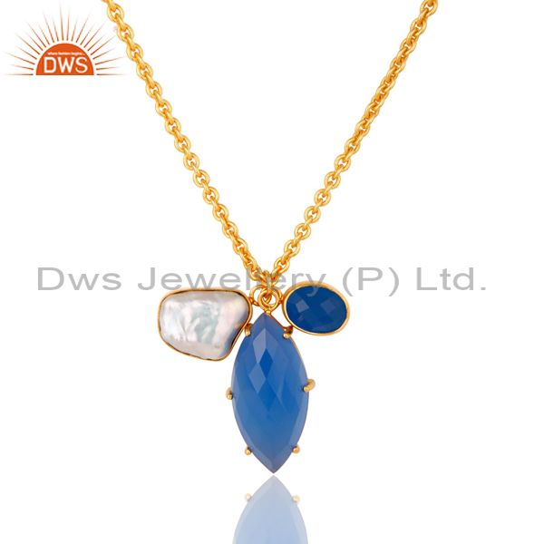 Blue Chalcedony and Pearl Bezel and Prong Set Handmade 18k Gold Plated Necklace