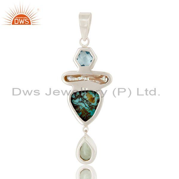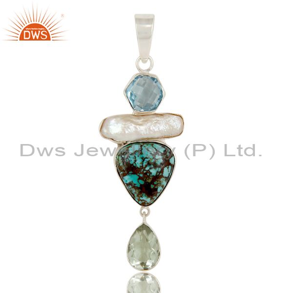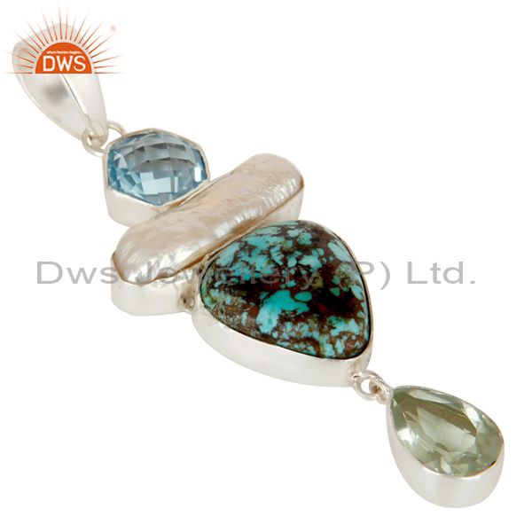 Boulder Turquoise, Prasiolite, Bt And Pearl Handmade Sollid 925 Silver Pendant