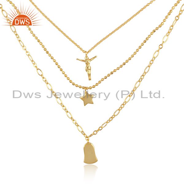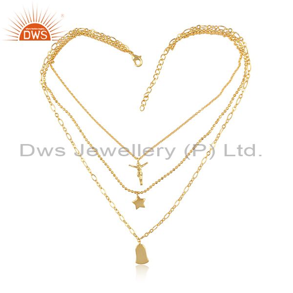 Cross, Star, And Bell Charms Set Brass Gold Triple Necklace