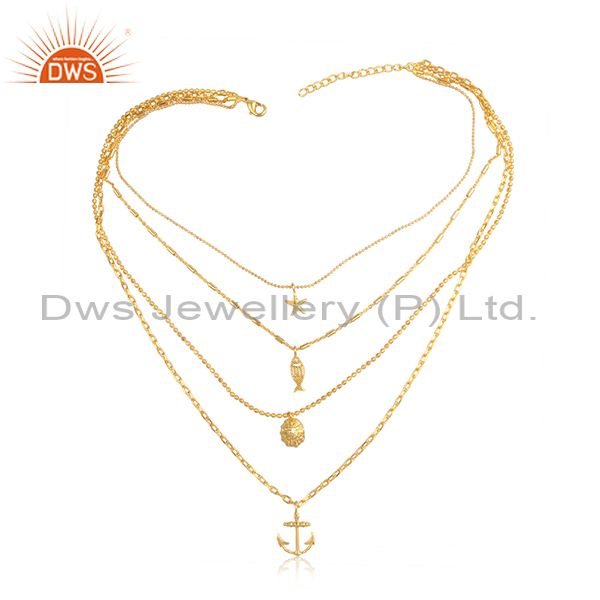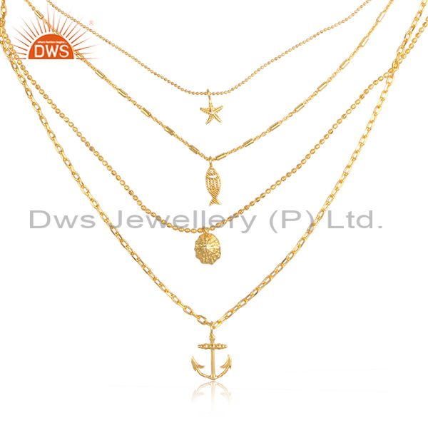 CZ Anchor And Star Charms Set Brass Gold Four Chain Necklace