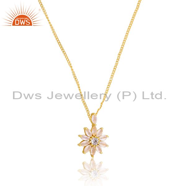 Cz And Rainbow Moon Stone Set Floral Pendant 18K Gold Chain