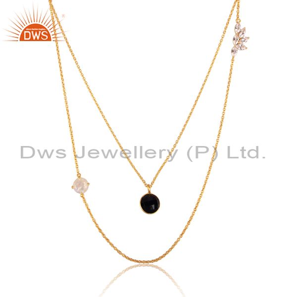 Cz, Black Onyx, Rainbow Moon Stone 18K Brass Gold Necklace