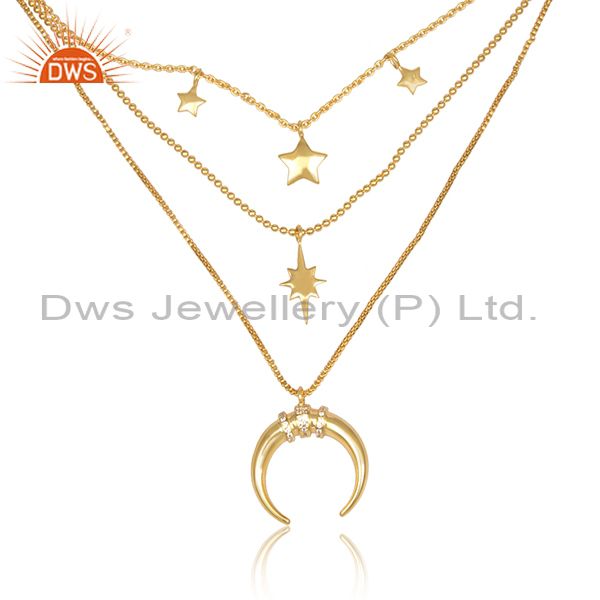 CZ Set Moon And Star Charms Triple Chain Brass Gold Necklace