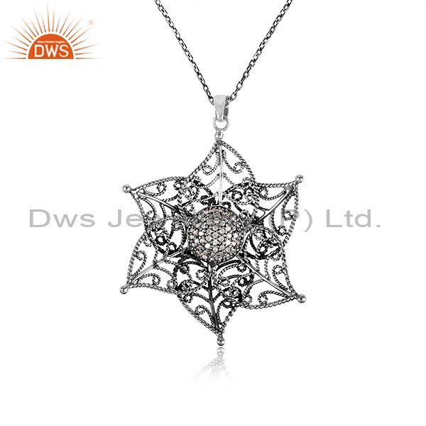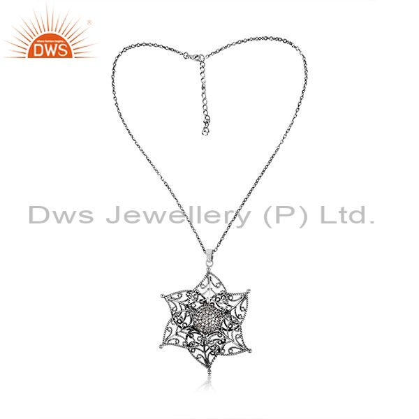 CZ Set Oxidized 925 Sterling Silver Floral Pendant And Chain